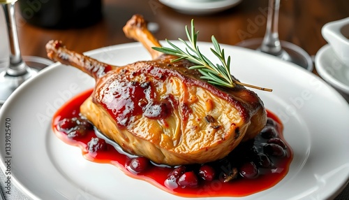Roasted Duck Leg Served with Cherry Sauce and Fresh Rosemary