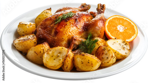 Roasted duck with orange and potatoes garnished with dill and rosemary lying on white plate
