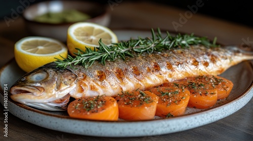Roasted fish with lemon, rosemary, and carrots.