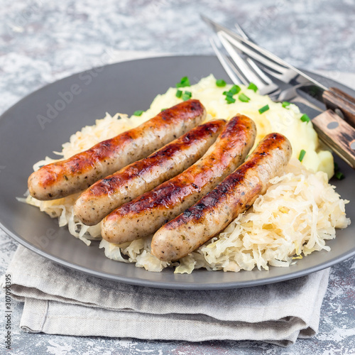 Roasted nuremberg sausages served with sour cabbage and mashed potatoes, on a gray plate, square