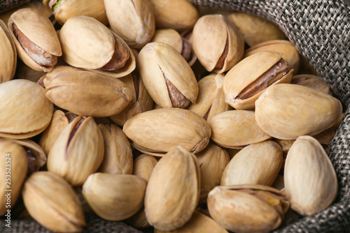 Roasted pistachios in gray bag on textured dark wooden background, top view. Copy space.
