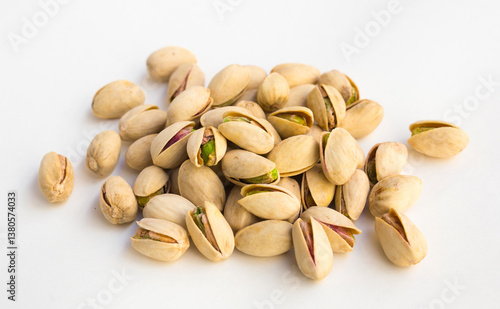 Roasted pistachios on white background