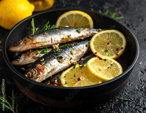 Roasted sardines with lemon slices