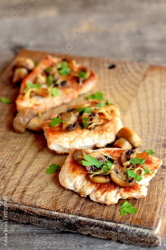 Roasted sliced Turkey fillet with cheese, agaricus and parsley on a cutting board and an old wooden table. Tasty cooked Turkey meat. Lunch, dinner, picnic menu. Closeup