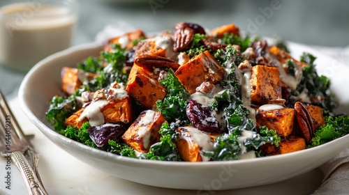 Roasted sweet potato and kale salad with tahini dressing, styled on a marble slab with soft shadow
