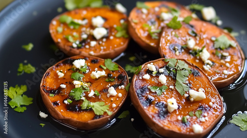 Roasted Sweet Potato Rounds with Honey and Feta on White Plate