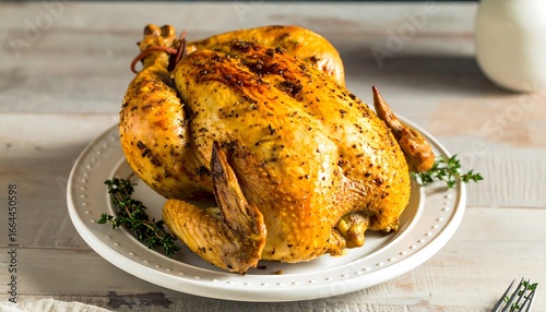 Roasted whole chicken on a white plate.