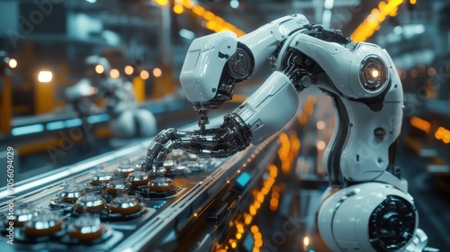 Robot arm assembling products in a high technology factory, mid angle, clean lighting. cinematic. 3D render. highly detailed,