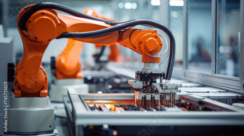 Robot Arms on Automated EV Battery Components Production Line. Electric Car Battery Pack Manufacturing Process. Conveyor Belt on Modern Factory.