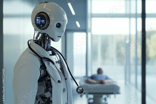 robot doctor is standing in front of a hospital bed. The robot is wearing a white lab coat and has a stethoscope around its neck. The scene is set in a hospital room