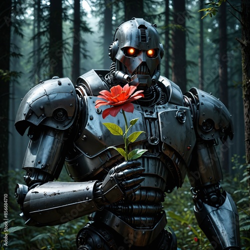 Robot Holding a Flower in the Forest.