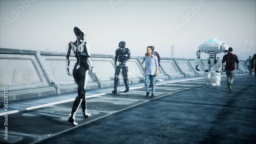Robot in Sci fi tonnel. Concept of future.. 3d rendering..3d rendering.