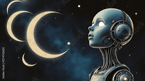 Robot Staring Into Swirl of Lunar Crescent Moons