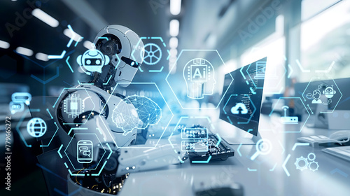 Robot using pc computer, AI icons hologram, chat bot. Ai generative illustration