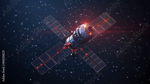 Robotic arm, attached to a space station, working on a satellite, background of stars