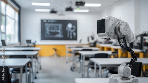 robotic arm in a modern classroom setting, representing the future of education and technology