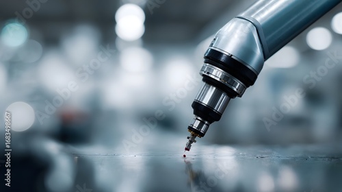 Robotic arm performing precise control measurement on a surface in a modern industrial setting with blurred lights