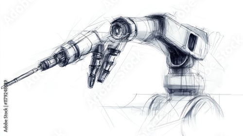 Robotic arm sketch, detailed design showing mechanical joints and precision tooling.