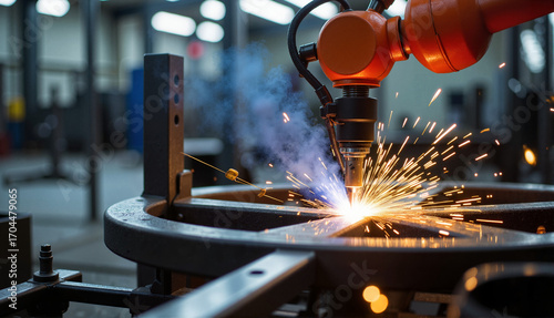 Robotic arm welding metal with sparks flying indoors, manufacturing and automation concept.