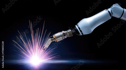 Robotic Arm Welding Sparks in Industrial Setting with High-Tech Automation and Modern Engineering Techniques Showcased Against Dark Background