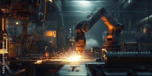 Robotic Arm Welding with Precision in Dark High-Tech Factory, Sparks Flying from the Torch