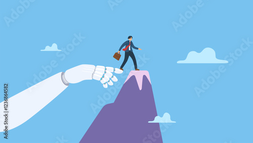 Robotic hand helps businessman to reach mountain peak symbolizes Artificial Intelligence help to success, future of AI working with humanity, robot automation or innovation support, business support.