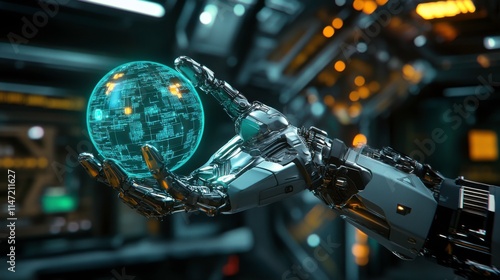 Robotic Hand Holding Glowing Sphere of Data