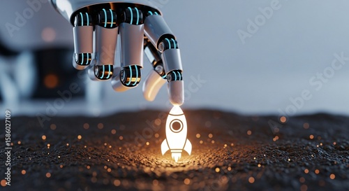 Robotic hand interacting with a glowing rocket icon on a textured surface, symbolizing technological innovation and startup launch.