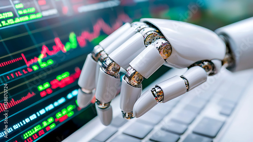 Robotic hand interacting with stock market data on digital screen, showcasing advanced technology and finance integration