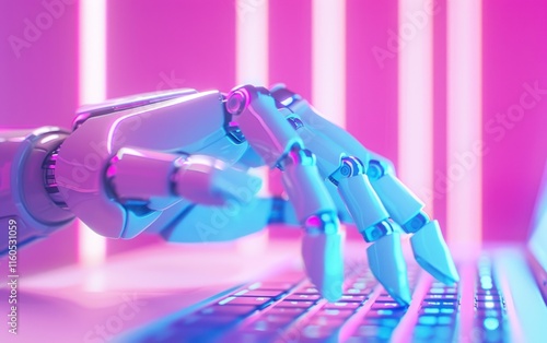 Robotic hand typing on laptop keyboard under neon light.