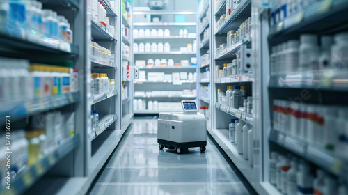Robotic pharmacy dispensing personalized medicine with precision accuracy in a high-tech distribution hub