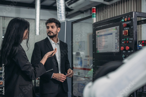 Robotic supervisor discuss with technical specialist from various department on strategic planning