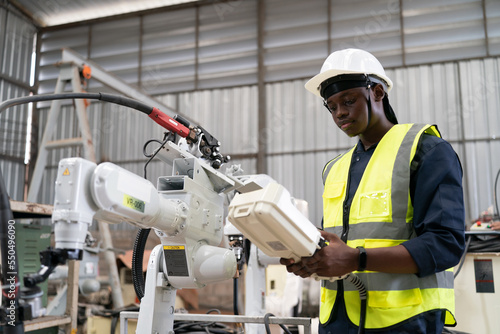 Robotics engineer working on maintenance of modern robotic arm in factory warehouse. Business technoloy.