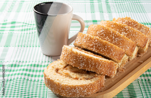Rocambole, Sliced roacambole stuffed with dulce de leche on a wooden tray and a cup on a table with a checkered tablecloth. dark background, selective focus.