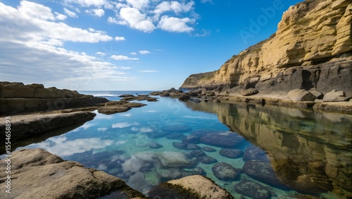 Rock pool reflecting blue sky and surrounding cliffs, sharp edges of rocks under shallow water