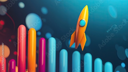 Rocket in vibrant color soaring up a graph, illustrating a company's fast upward trajectory and business success.