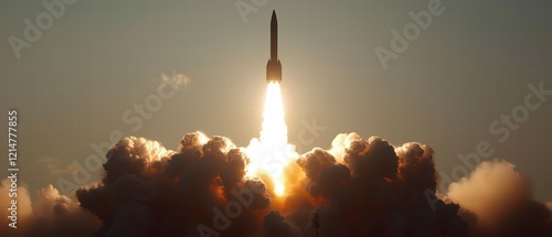 Rocket Launch Against Sky at Sunset with Bright Flames and Smoke