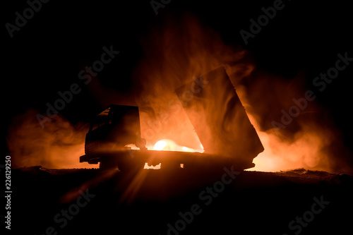 Rocket launch with fire clouds. Battle scene with rocket Missiles with Warhead Aimed at Gloomy Sky at night. Rocket vehicle on War Backgound