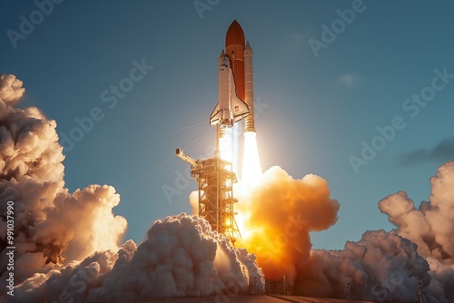 Rocket launches into the sky with a brilliant explosion of flames and smoke at daytime, showcasing the power of space exploration