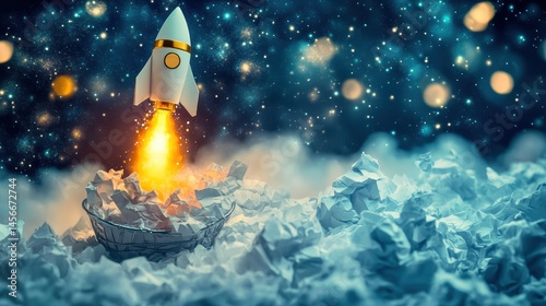 Rocket Launching from Paper Basket into Starry Sky Dreamlike Conceptual Illustration