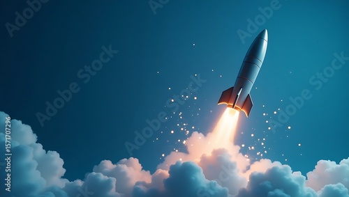 Rocket launching through clouds with fiery exhaust and sparks isolated on white background