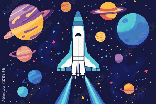 Rocket Ship Launching Among Colorful Planets and Stars in Space Travel Adventure for Exploration
