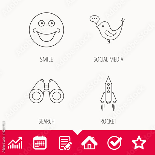 Rocket, social media and search icons. Smiling face linear sign. Edit document, Calendar and Graph chart signs. Star, Check and House web icons. Vector