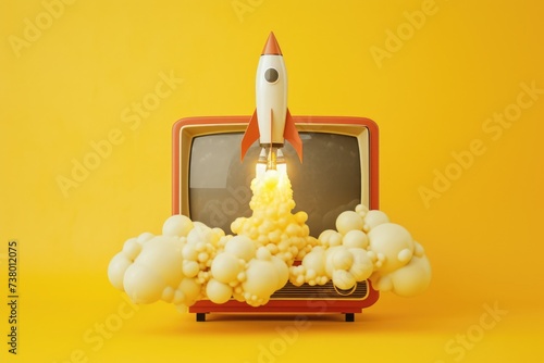 Rocket taking off from an old TV screen, startup and information concept, yellow background.