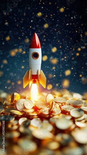 Rocket taking off surrounded by gold coins and diamonds with blue light effects, showcasing space travel, smart logistics, and futuristic AI driven technology concepts
