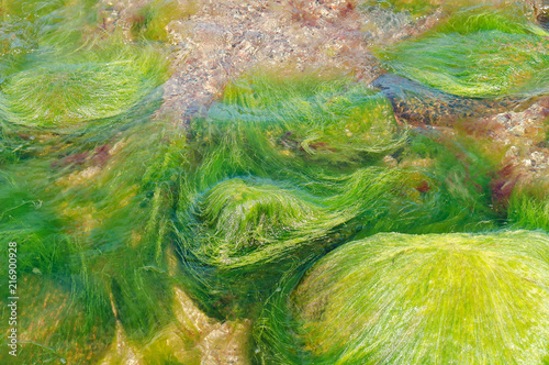 Rocks in the sea overgrown with algae. Sea green algae.