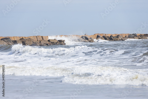 Rocks on the beach, breakwater, ocean, waves, blue sky