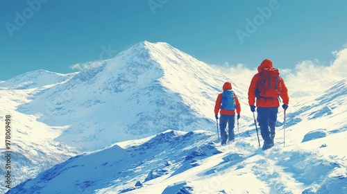 Rocky mountain pass with snowdrifts, mountain climbers hiking, clear blue sky, cold crisp lighting