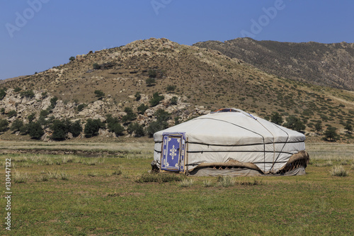 Rocky mountains behind ger, Nomad camp in summer, Khogno Khan Uul Nature Reserve, Gurvanbulag, Bulgan province, Northern Mongolia