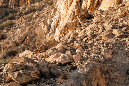 Rocky terrain with sunlit brown boulders and sparse vegetation